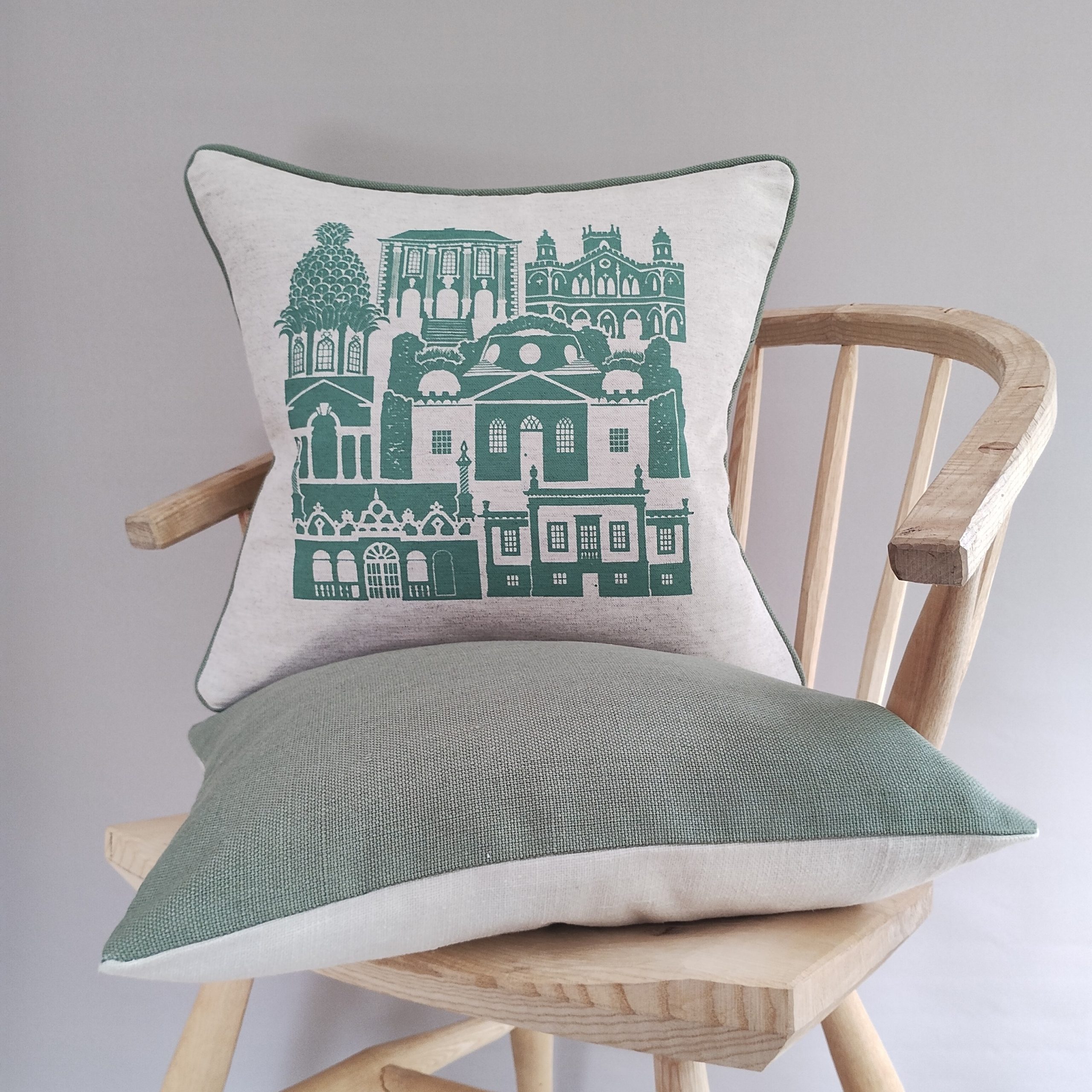 These cushions are printed to order onto a linen/cotton blend, and sewn by me with a complimentary shade of linen mix for the backing & piping. Completed with a zip fastening, supplied either as cover only or with feather inner.