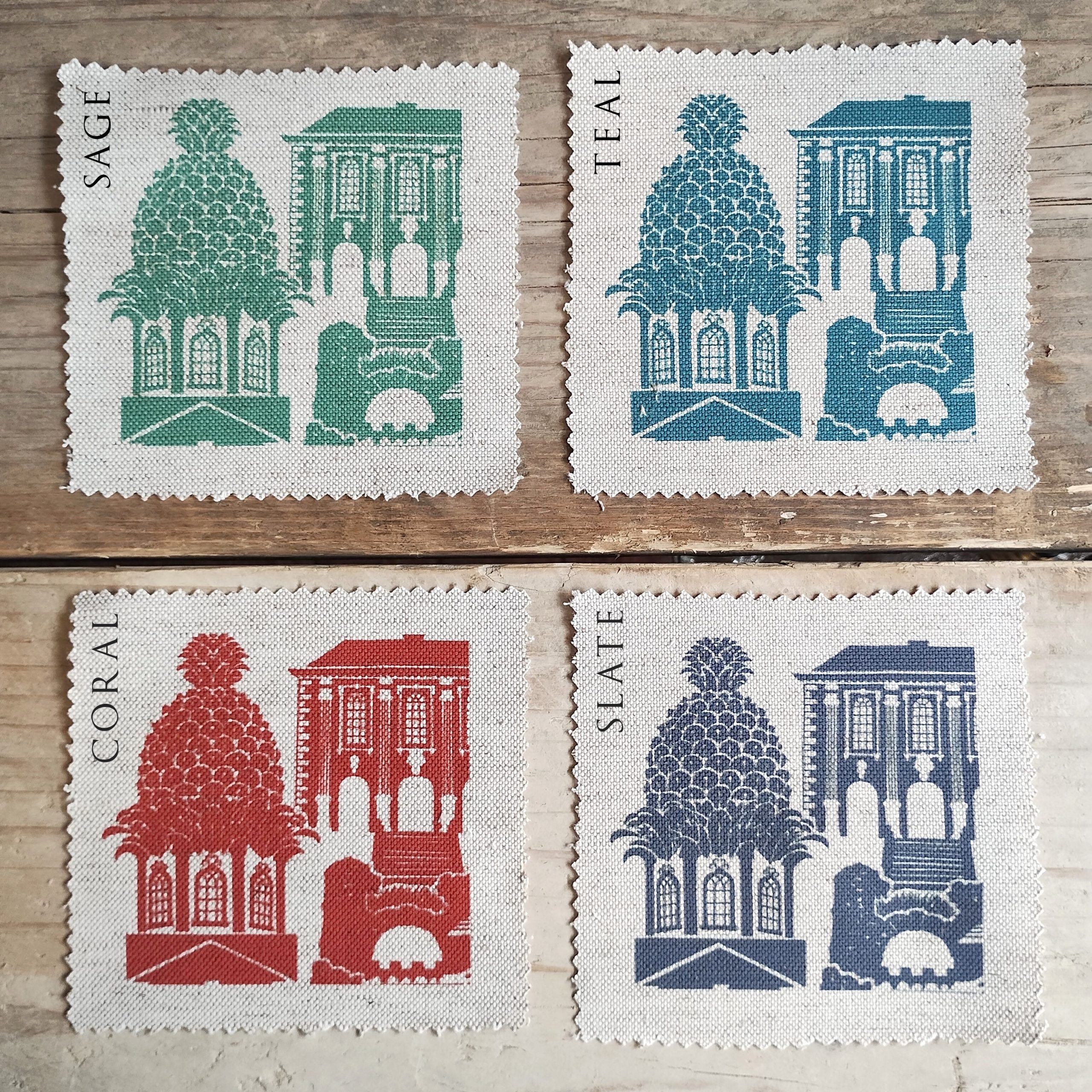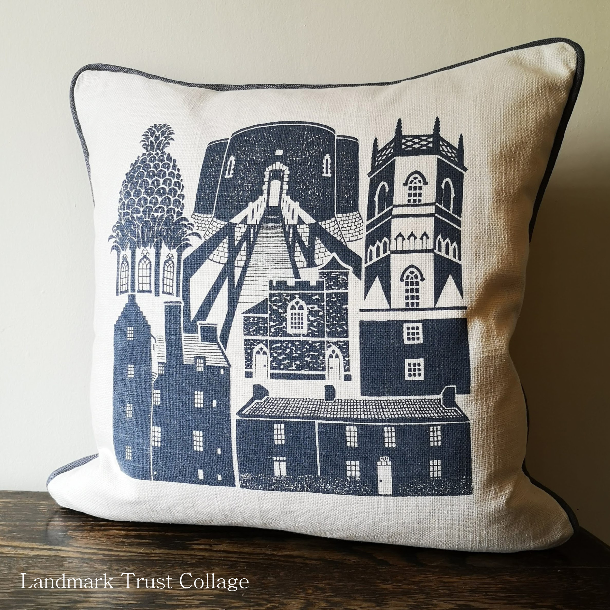 My bespoke cushion service offers you the chance to bring together the buildings of your choice into a personal composition. I first started making these to combine my customers’ favourite Landmark Trust properties into a collage, creating a memento of cherished times spent in special places. Since then I have produced designs for a variety of towns, estates & buildings, and invite you to nominate any places which are meaningful to you for me to interpret.