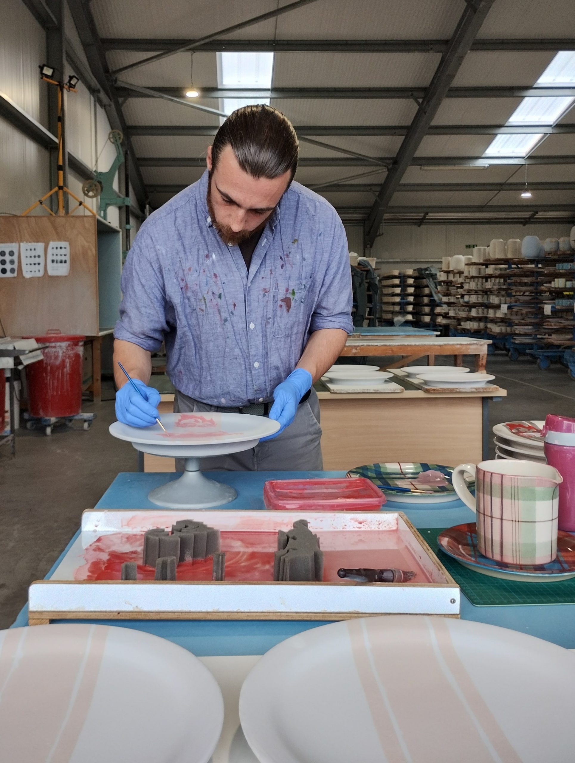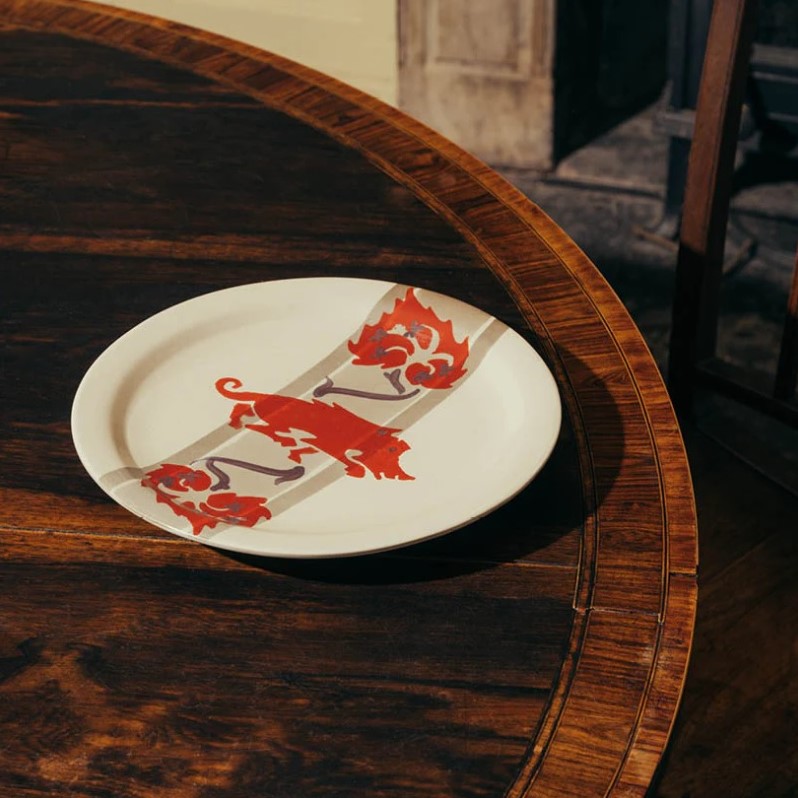 My plate is inspired by the Pictish heritage of the Tarbat Peninsula where Anta is located, and is a new interpretation of my Boar textile print. The main motif is derived from an 8th Century zoological carving on a fragment of stone unearthed in the excavation of Scotland’s only Pictish monastery at Portmahomack. I reimagined this with other elements in a manner inspired by Celtic revivalist George Bain, whose design archive is held on the Black Isle. In recognising the similarities in style and process between ceramic spongeware and my usual medium of printmaking, I chose to honour Anta’s traditional technique in creating my own plate and used sponge rollers and cut stamps to apply each element of my design. The colours were chosen from Anta’s existing palette and I hand-painted the finer details to give each plate a unique finish.