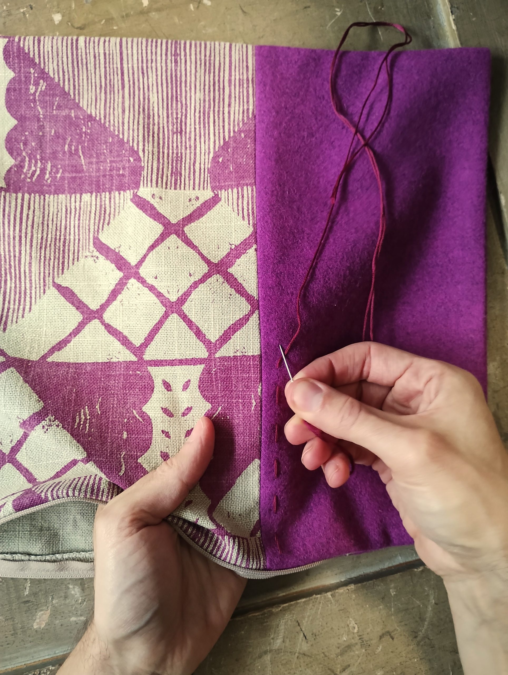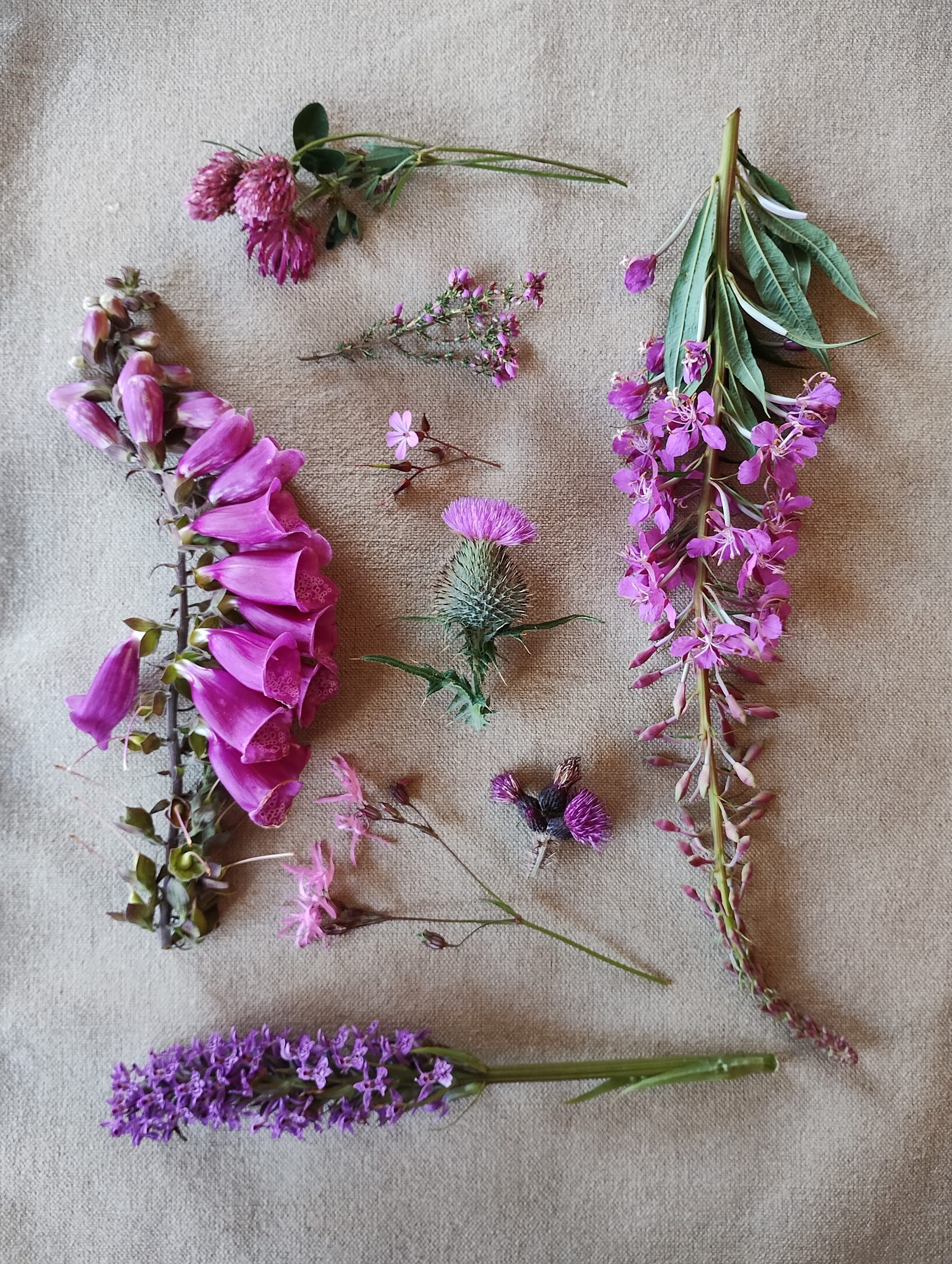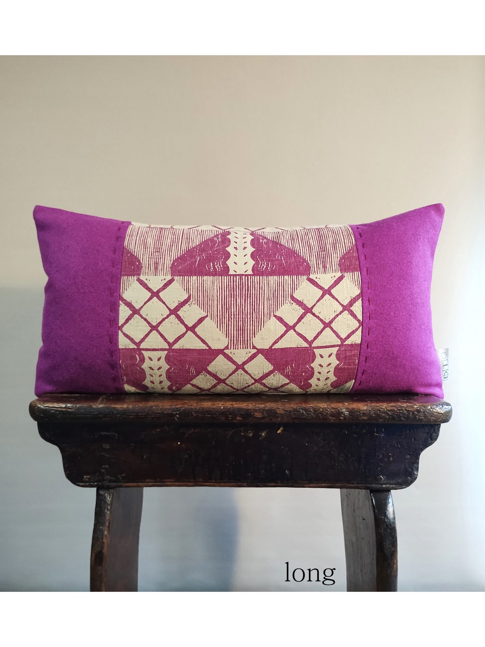 Hand-printed in a wildflower-inspired pink on pale green linen, panelled with a vibrant pink wool and finished with subtle hand-stitched detailing, each piece is uniquely handmade from start to finish. I have conceived and created this range to harness summer’s energy through the season’s vibrant palette of heather, clover, foxglove and thistle which abound through my local landscape.