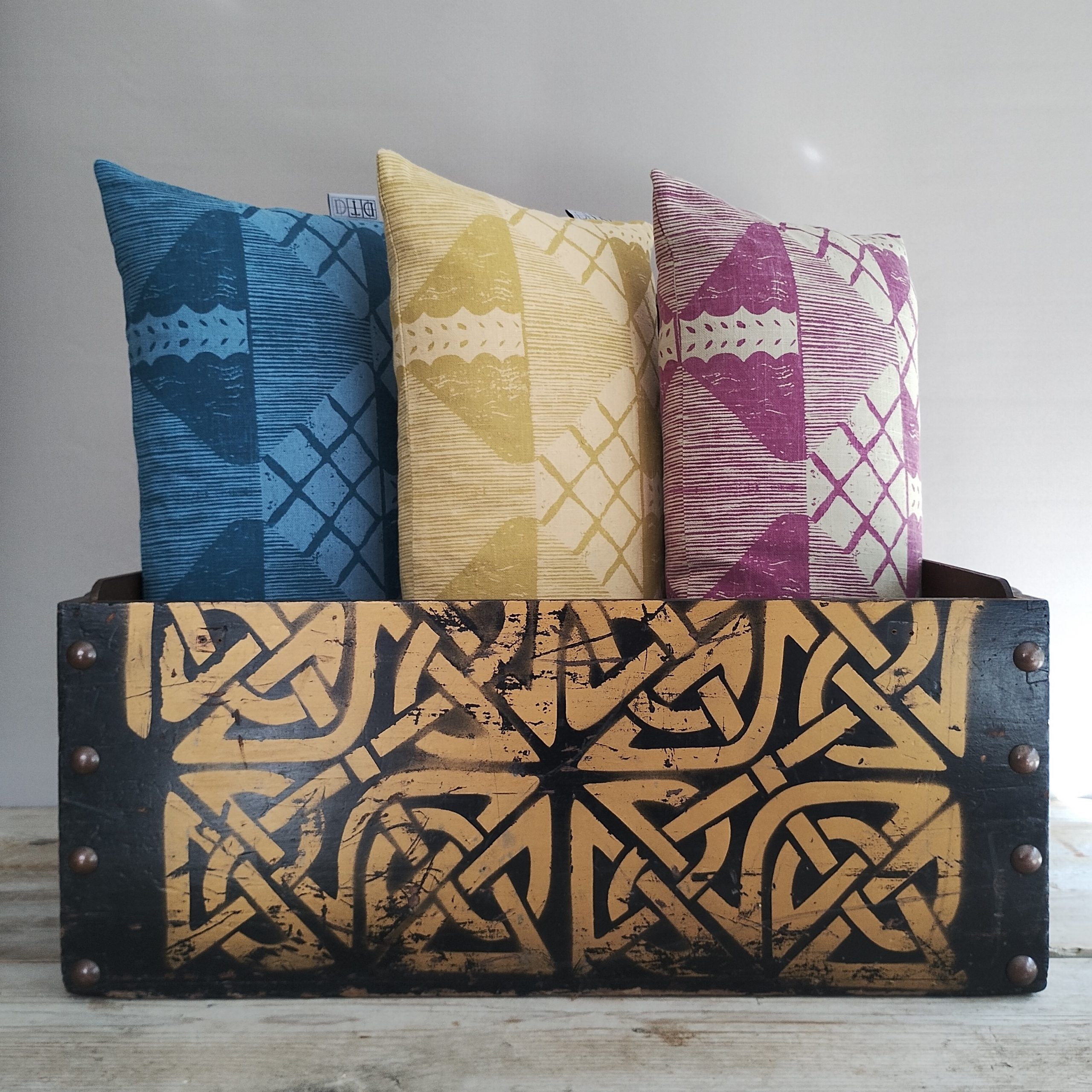 I proudly hand craft these cushions from start to finish in my studio in the Scottish Lowlands. Each is individually screen-printed onto 100% linen and stitched double-sided for a particularly sumptuous finish. They come complete with a plump feather inner and zip fastening. Usually made to order – please allow up to 2 weeks for production.