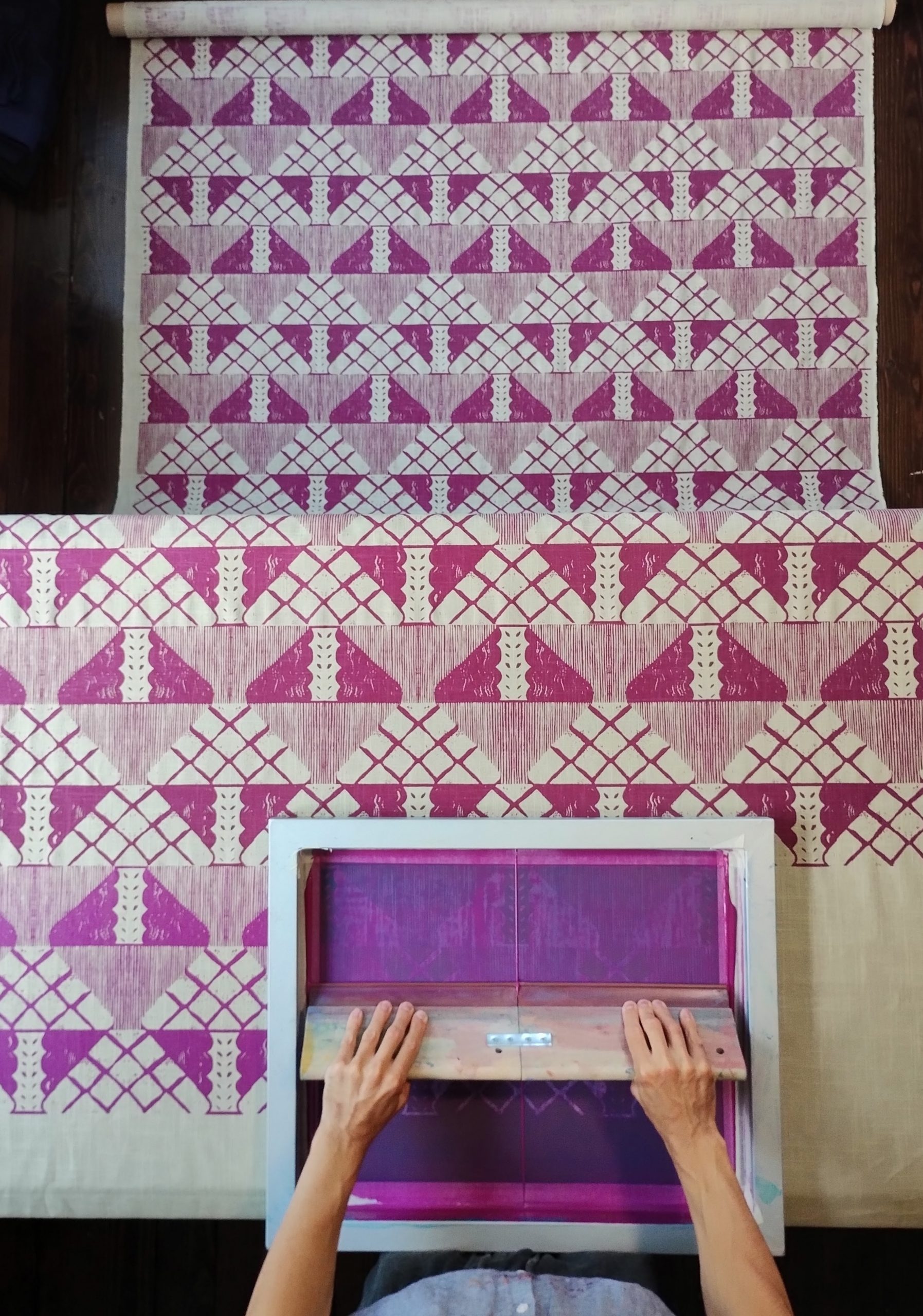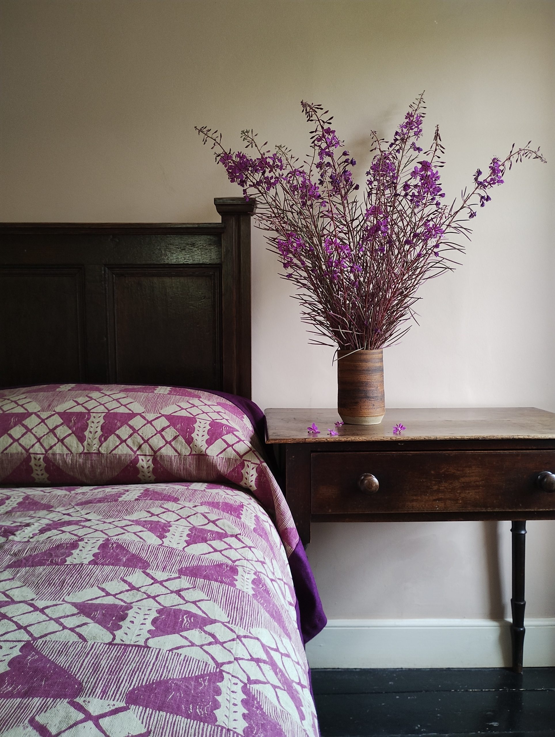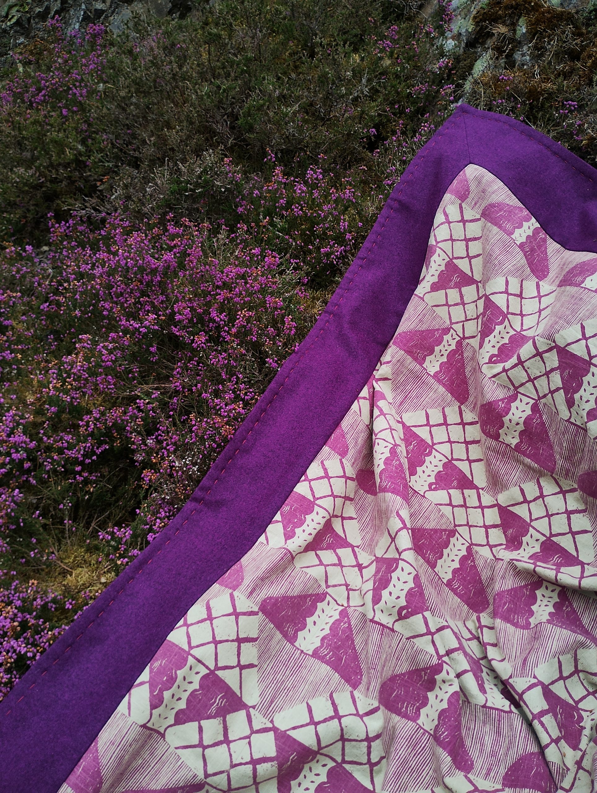 Hand-printed in a wildflower-inspired pink on pale green linen, edged in a deep purple wool and finished with hand-stitched detailing, this piece is uniquely hand-crafted from start to finish. I have conceived and created it to harness summer’s energy through the season’s vibrant palette of heather, clover, foxglove and thistle which abound through my local landscape.