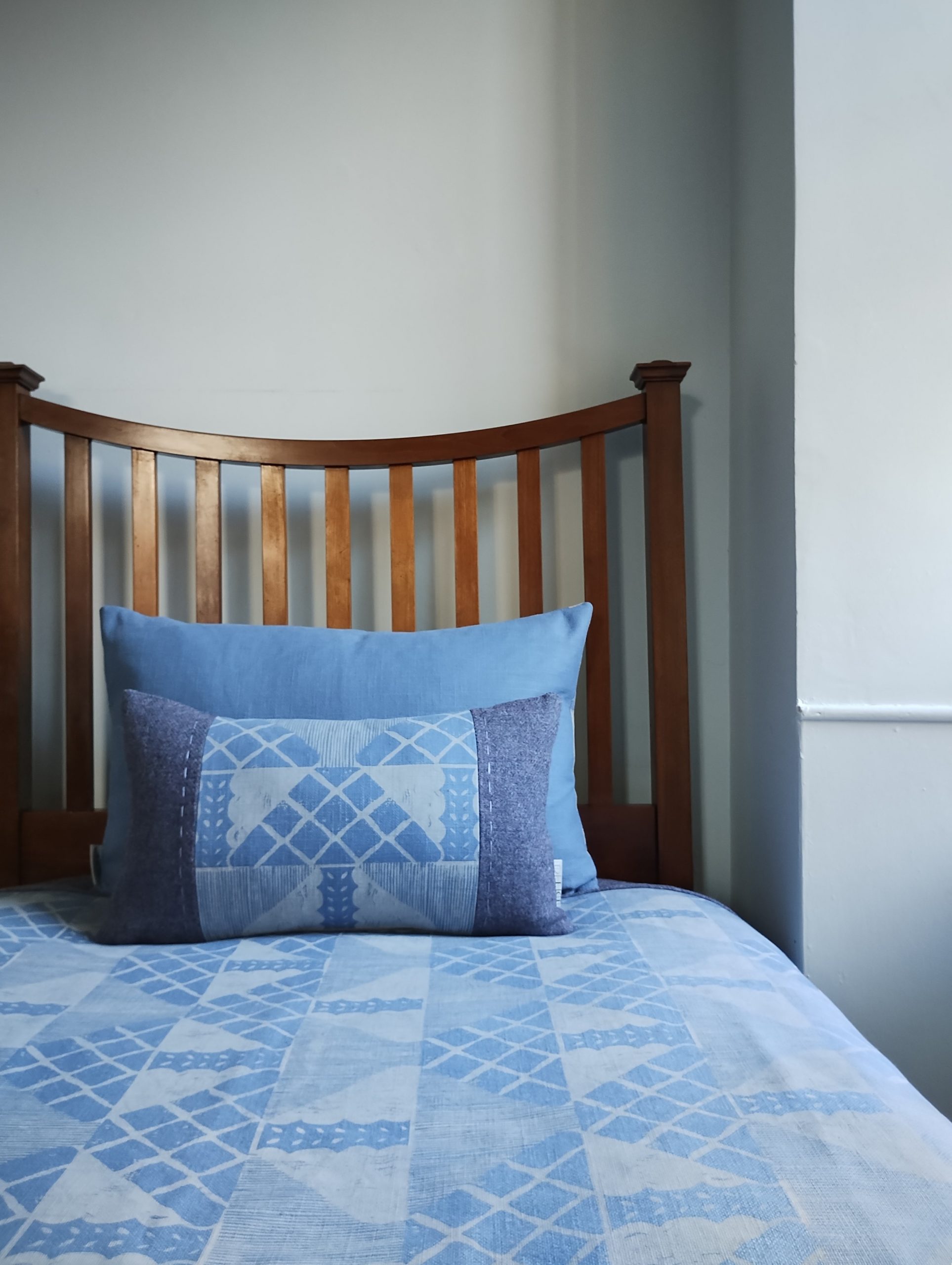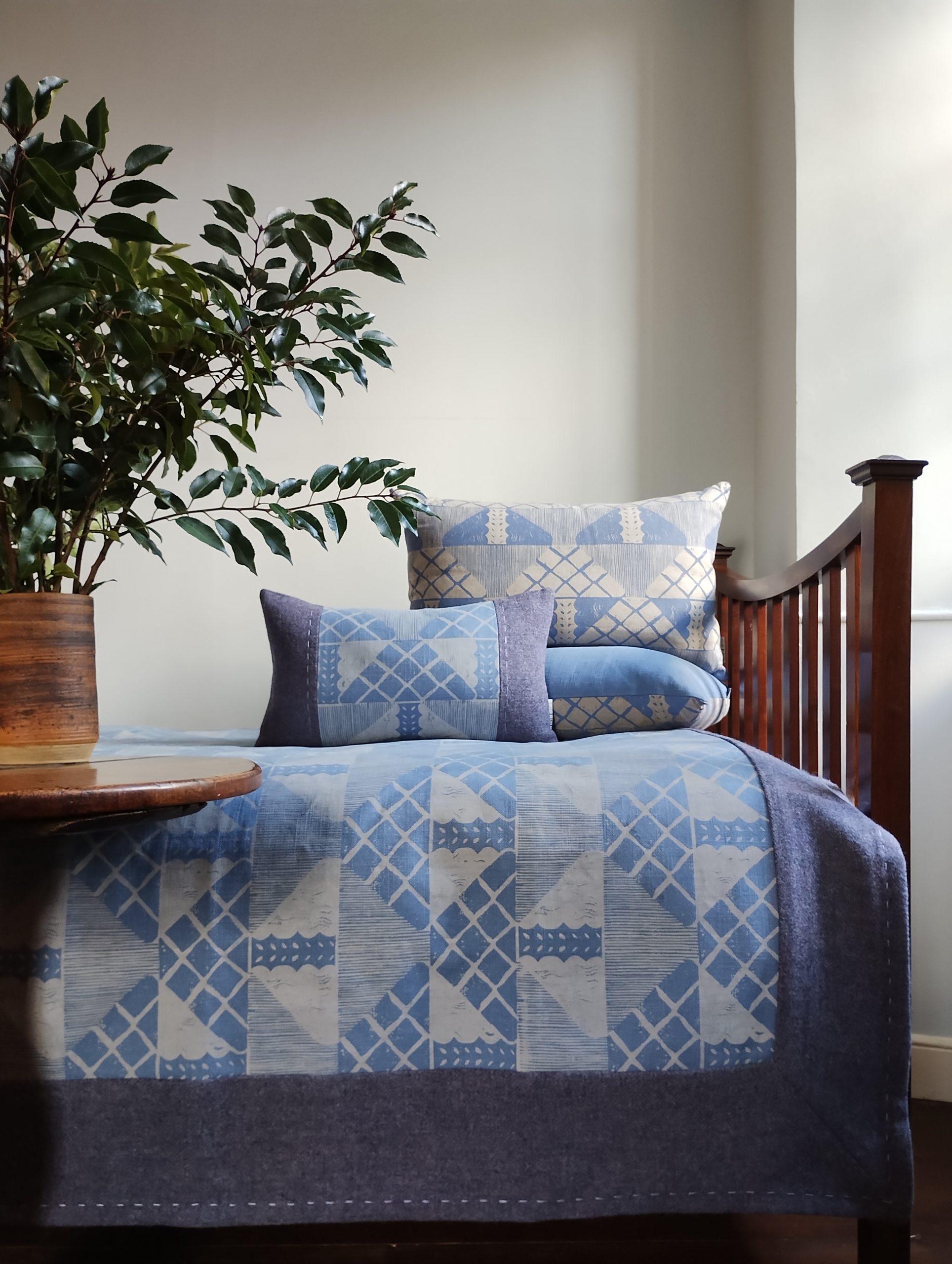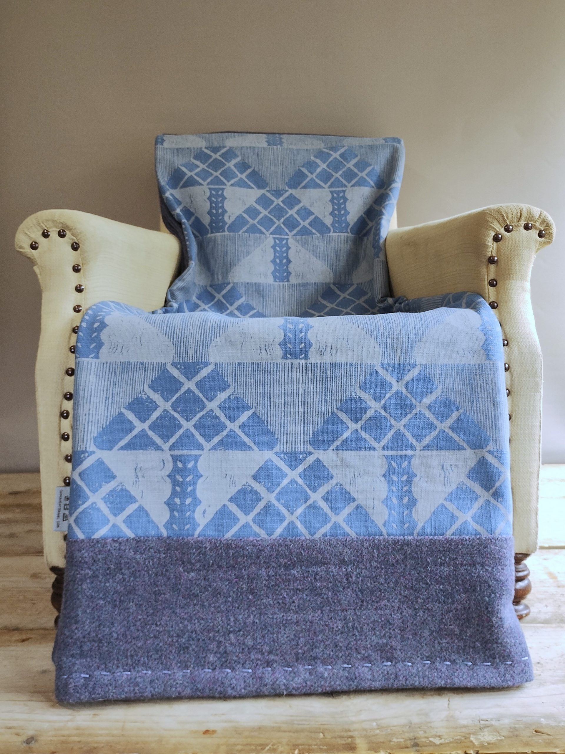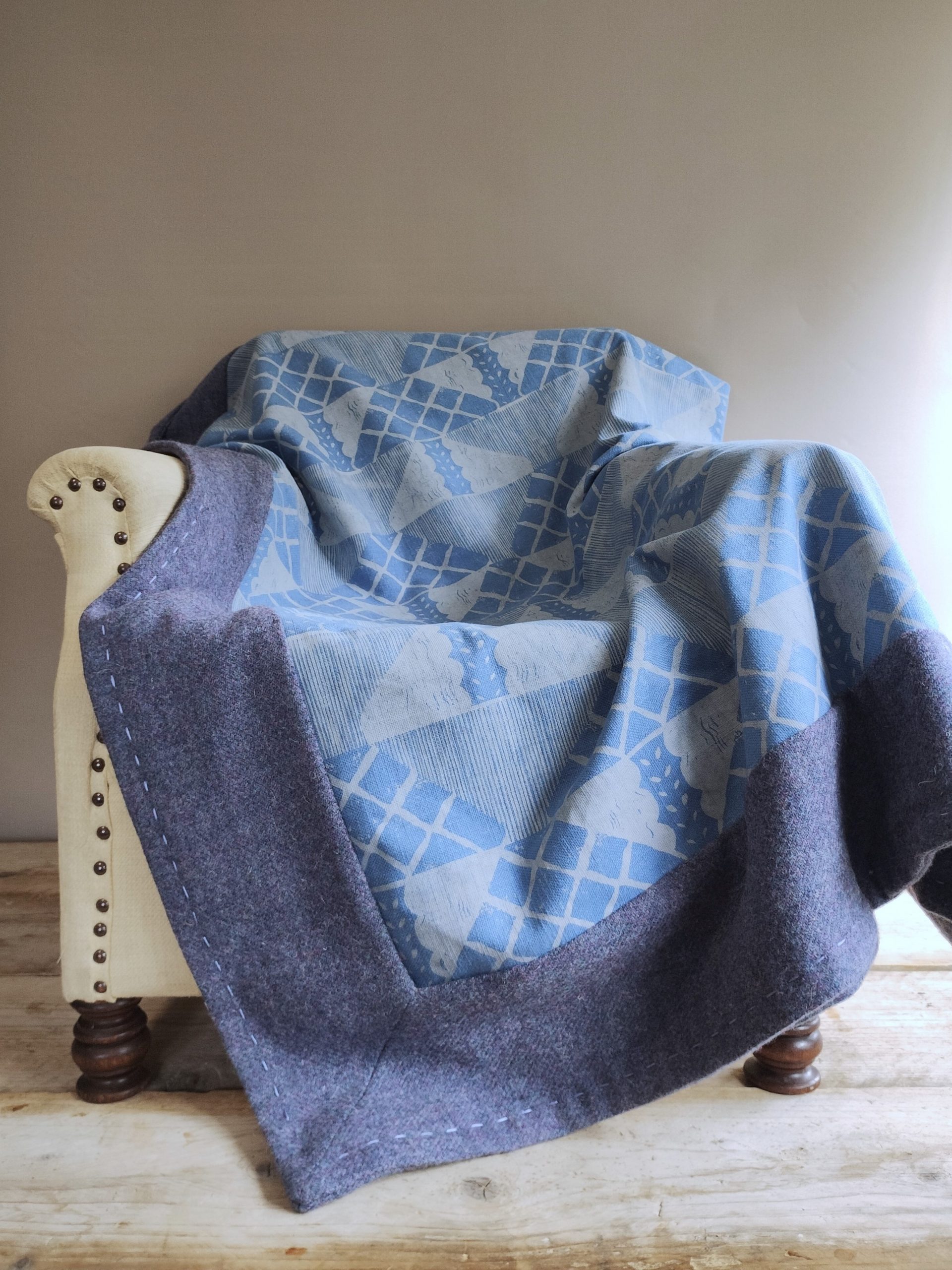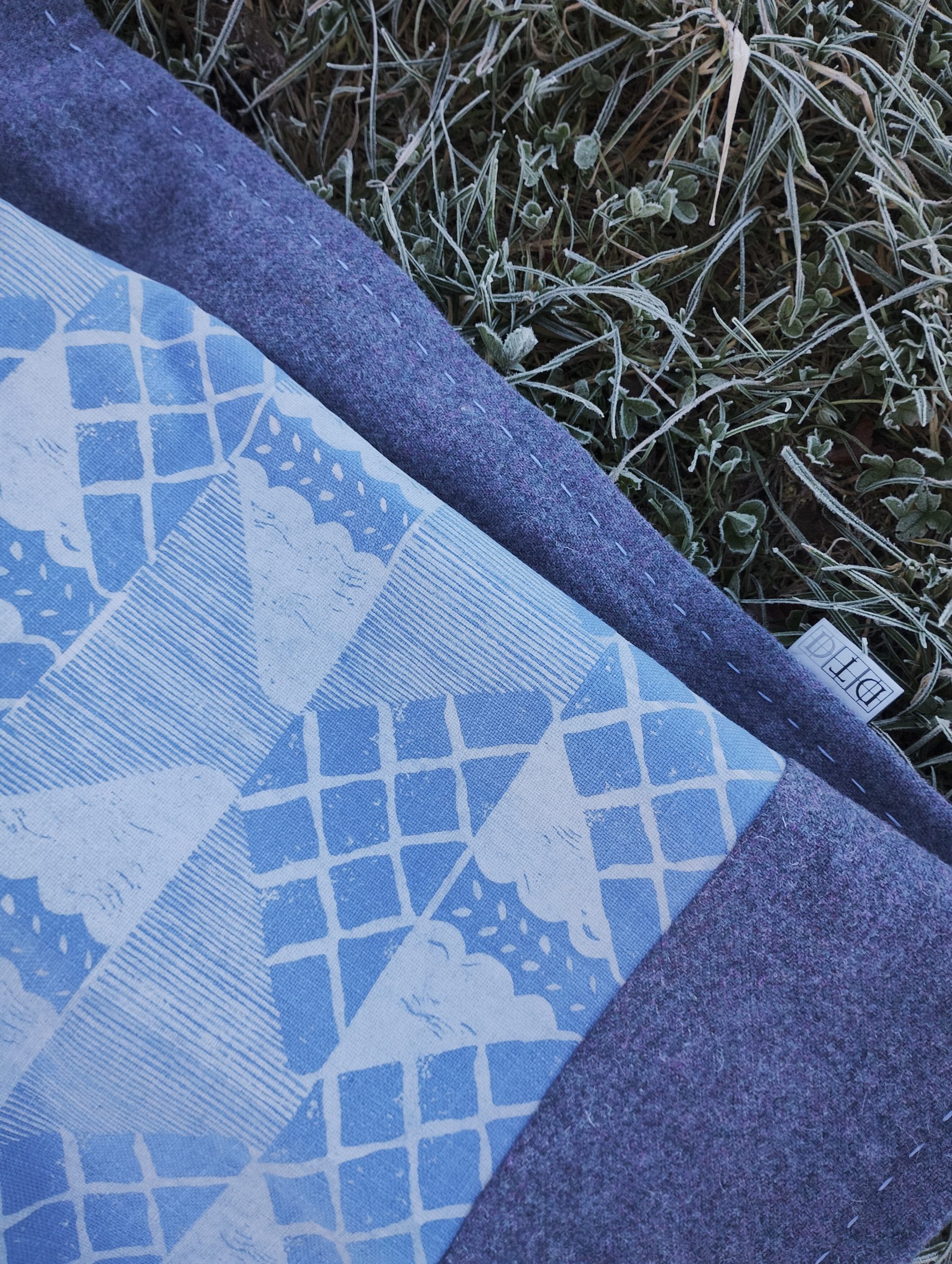 Designed to evoke the frosty whites of the season, this piece is hand-printed in lichen white on blue heavyweight linen union, edged in a blue wool with flecks of mauve, and finished with hand-stitched detailing. It is uniquely hand-crafted from start to finish as a one-off item taking inspiration from nature’s fading palette at this time of year.