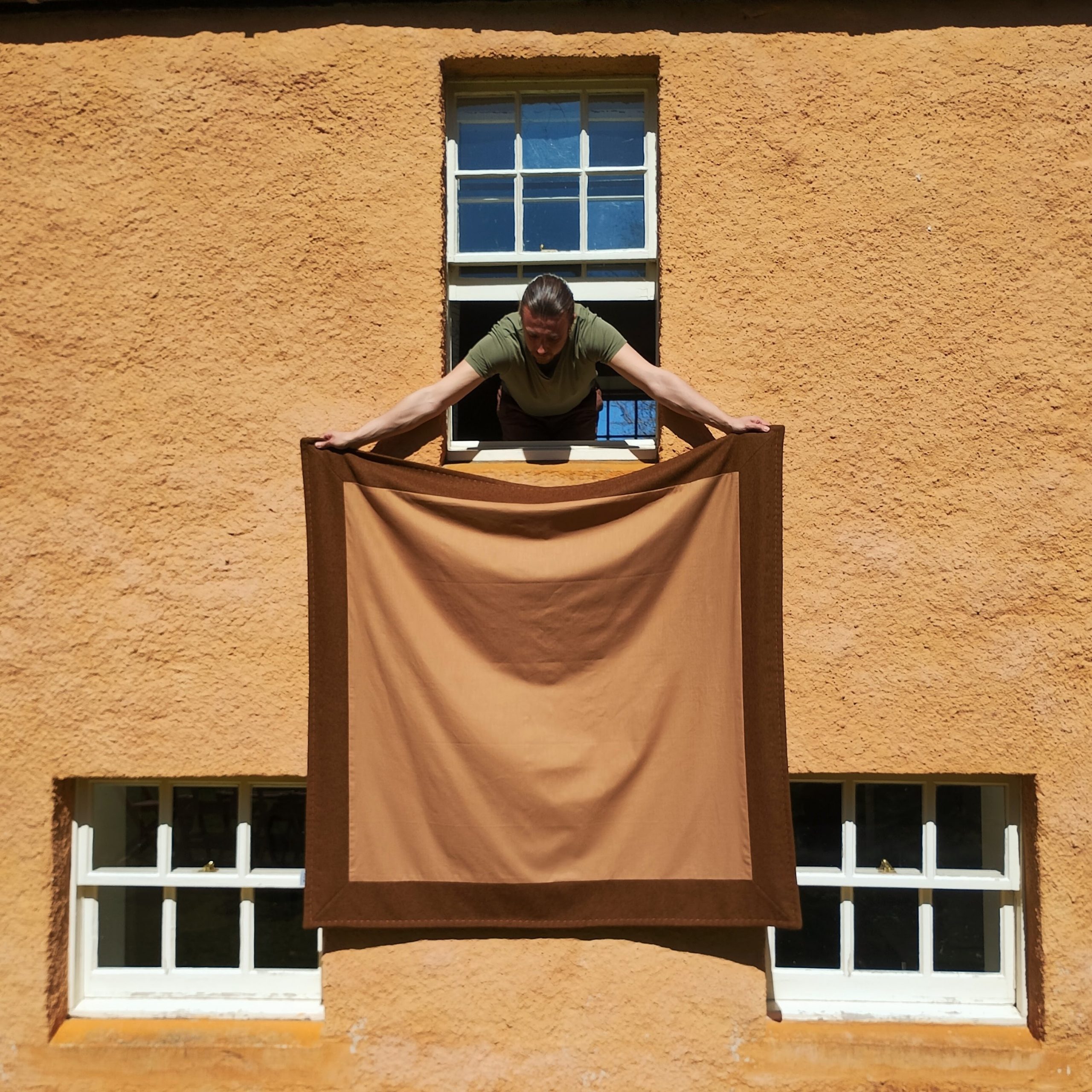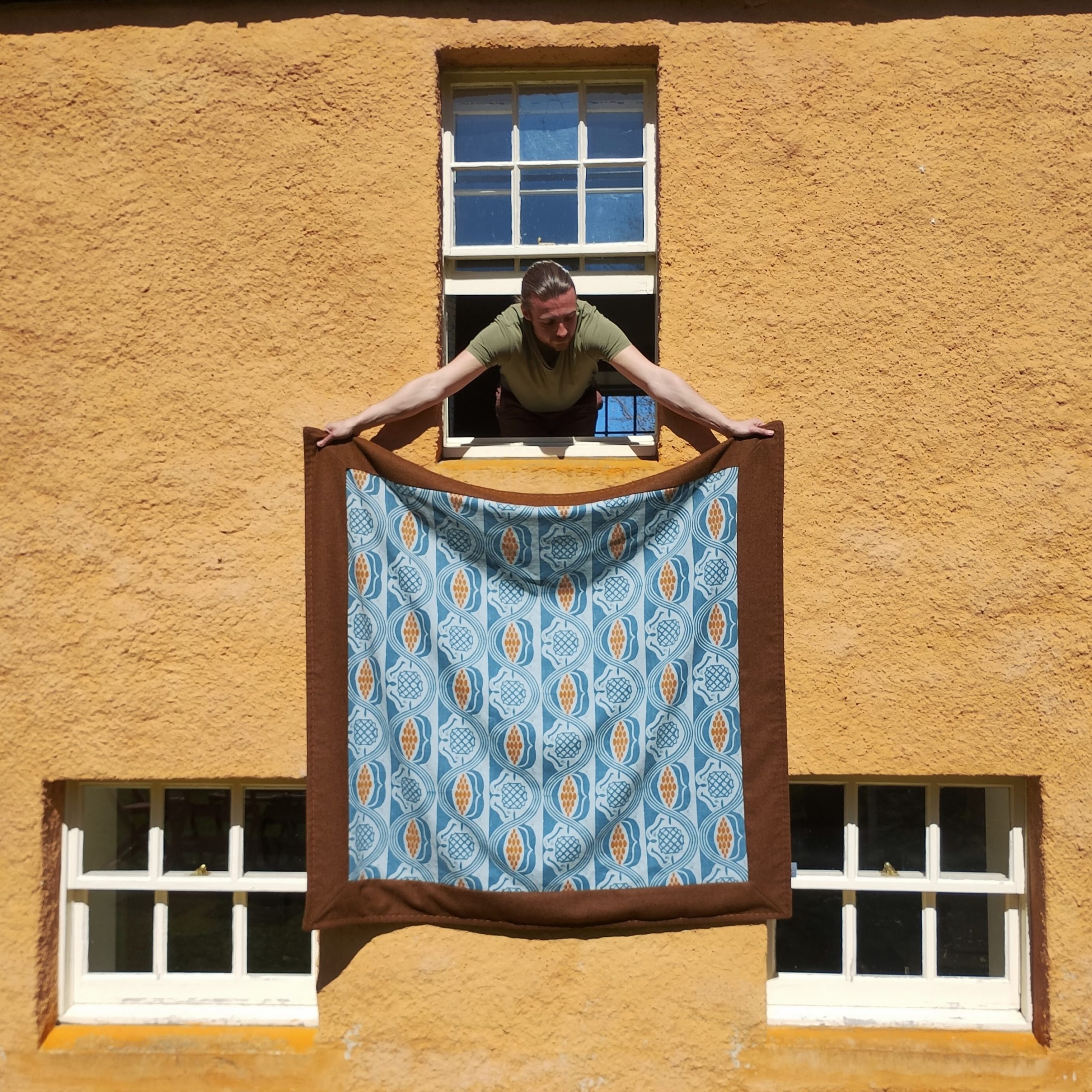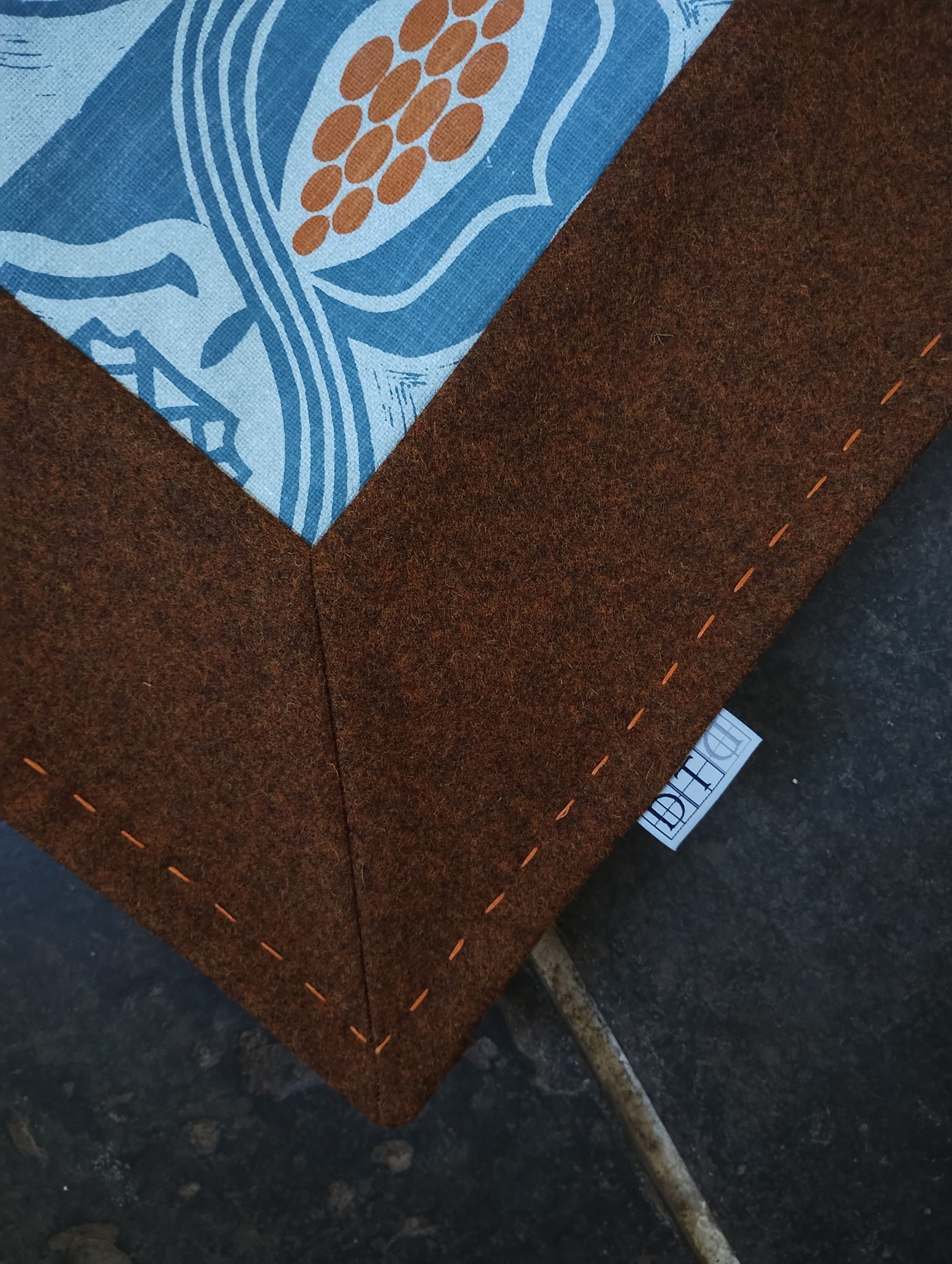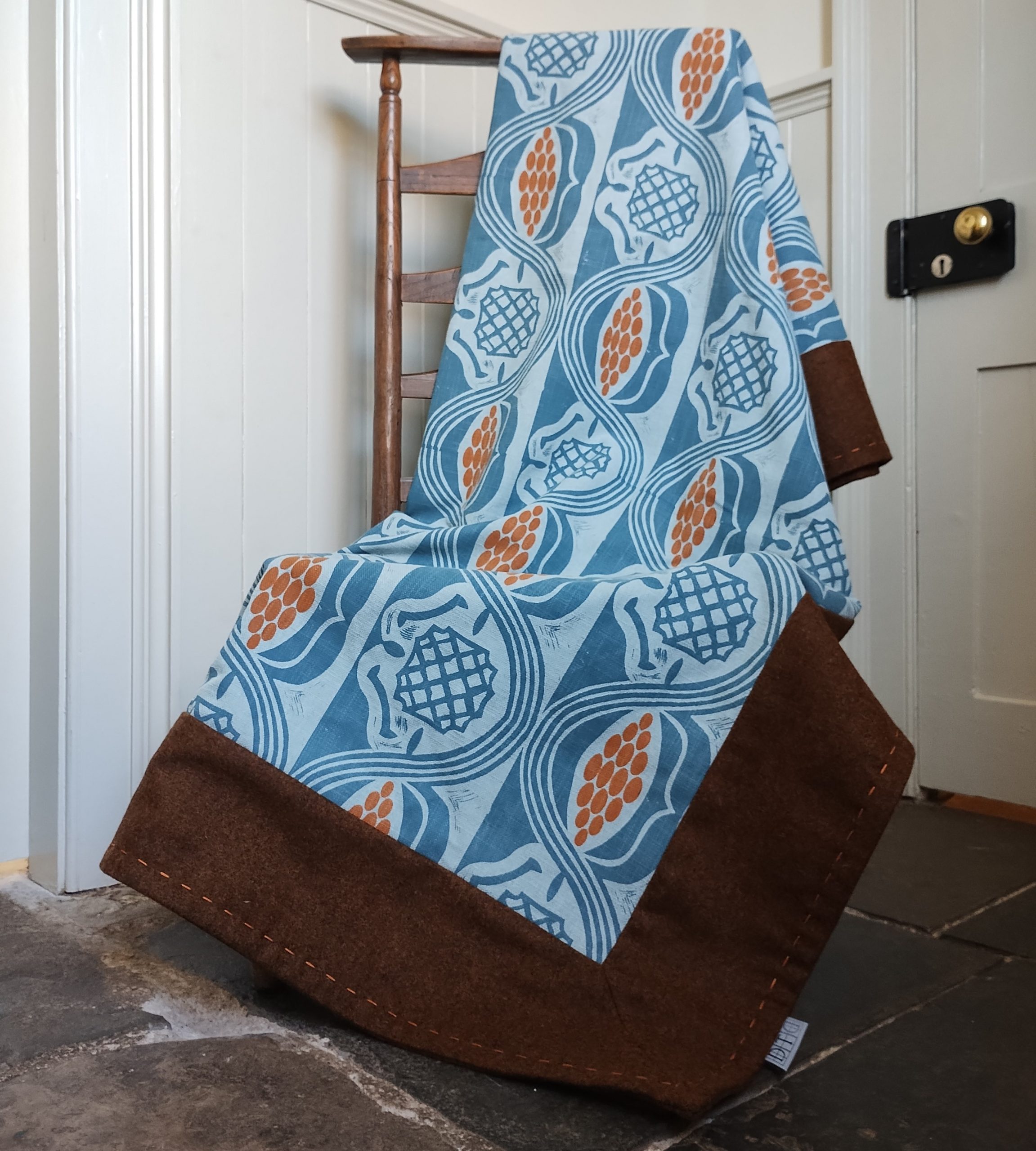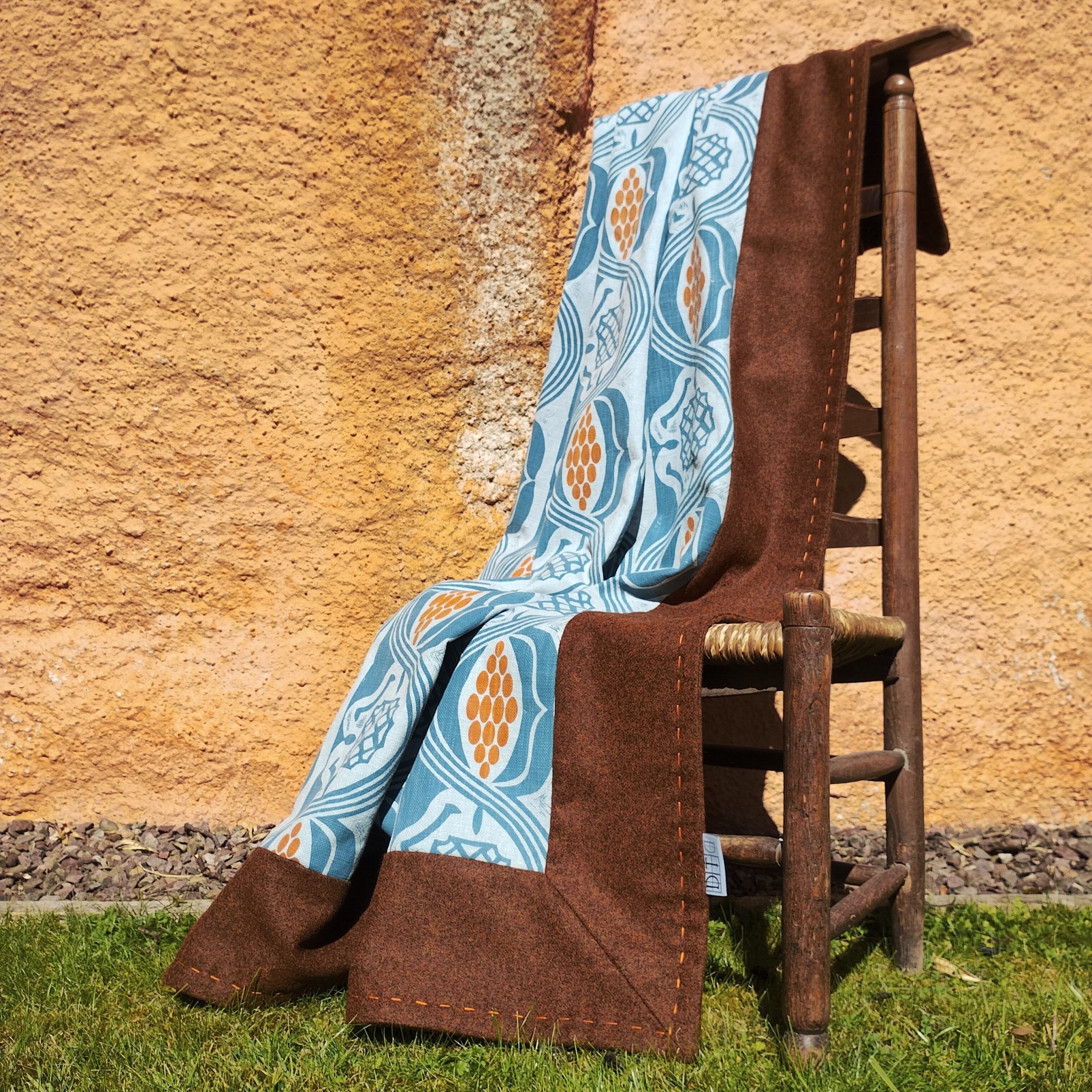 This throw is backed with a coordinating plain linen with edges of British wool, which I’ve hand-stitched in orange to finish.
