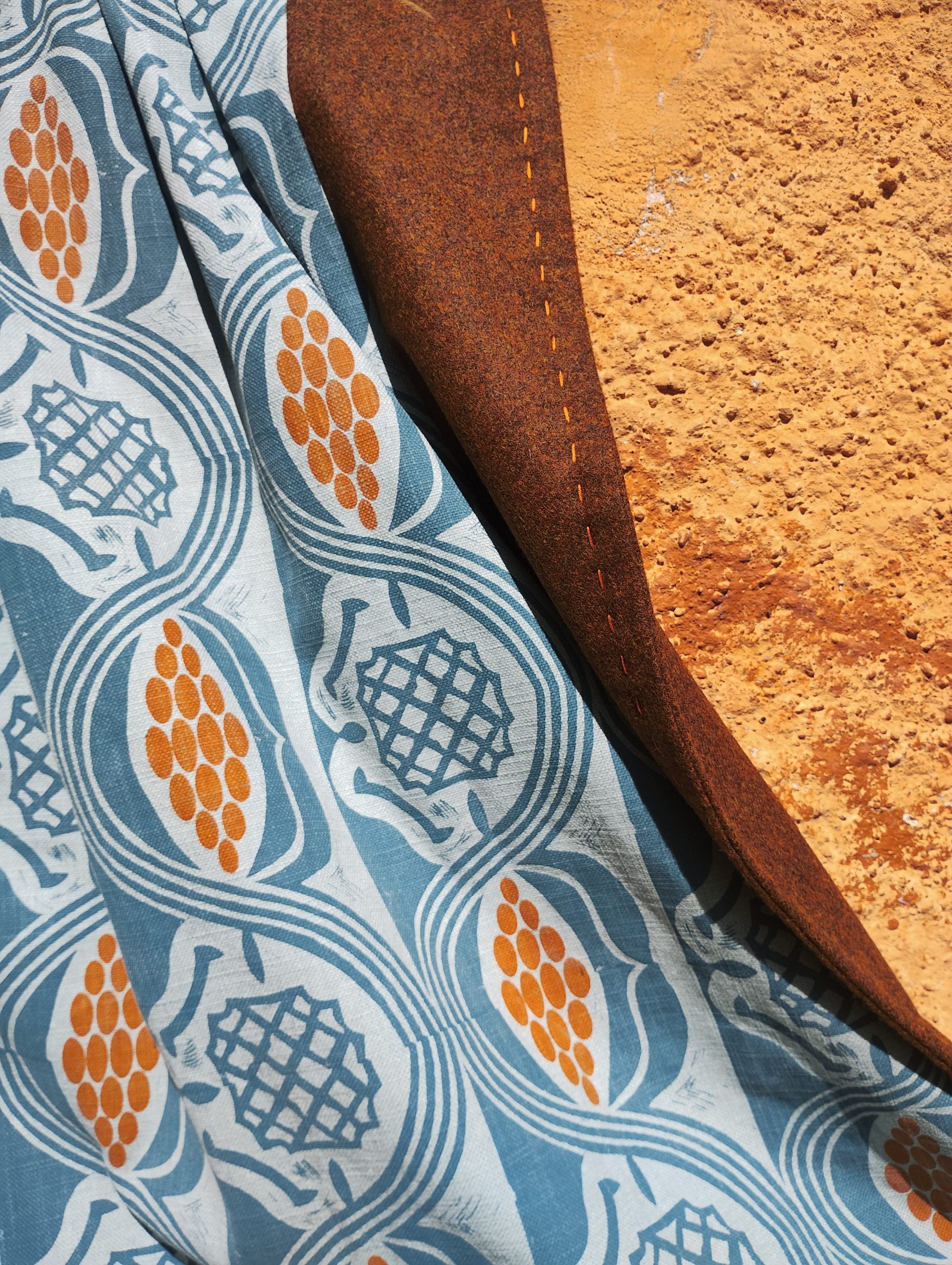 The main pattern, incorporating Tudor roses & pomegranates, is hand-printed in teal blue on a paler blue back cloth of cotton/linen/viscose to create a rich two-tone effect. In a departure from my usual single colour approach, I have individually printed each set of pomegranate seeds in a richly contrasting shade of orange to bring this piece to life.